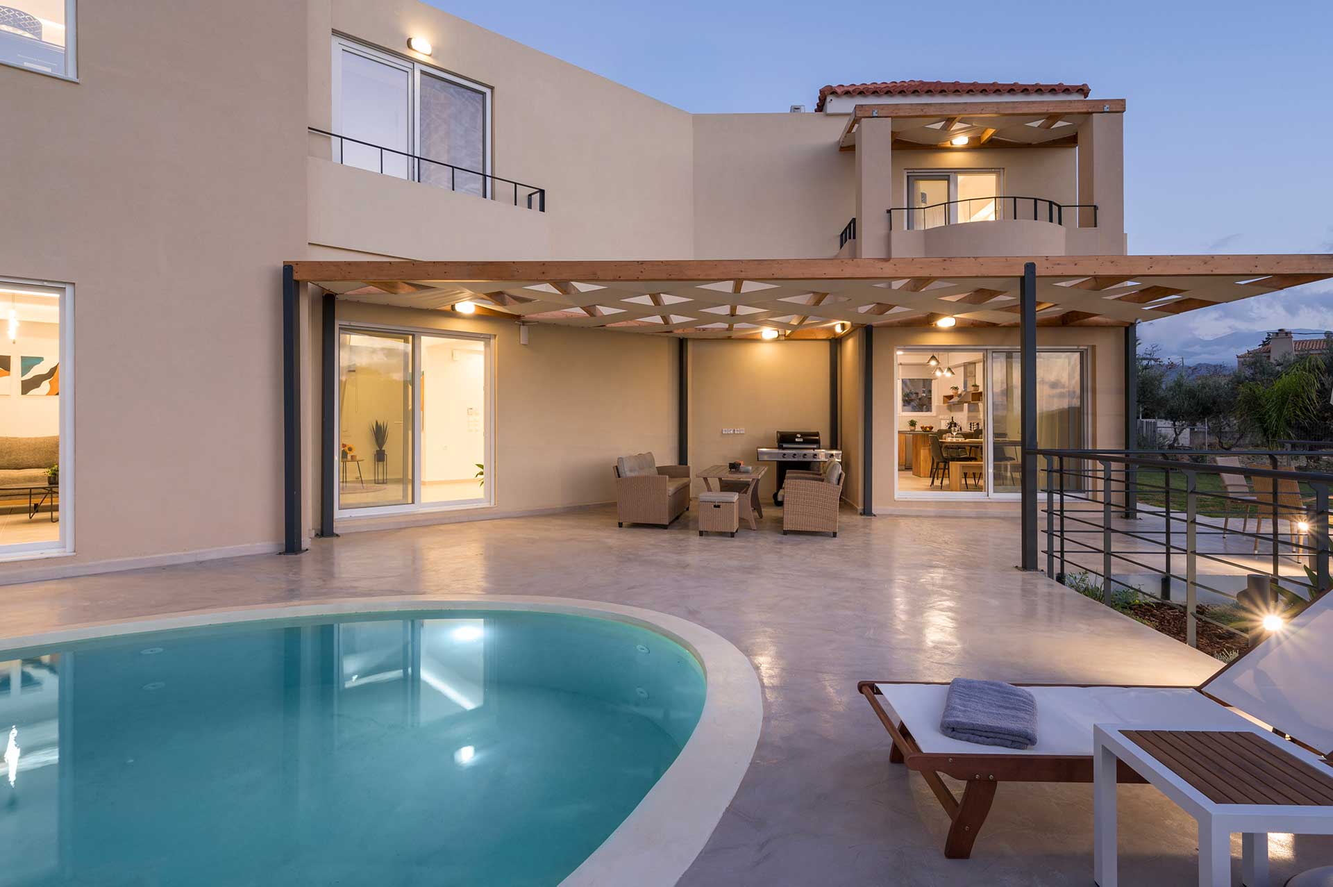 Outside, the villa feels like a little private retreat with a swimming pool set in the middle of a spacious garden, sun loungers, an outdoor shower, and a BBQ area for relaxed dinners at home. Add private parking and a fully equipped kitchen for day to day comfort, and you get that simple “arrive and settle in” feeling from the first day.